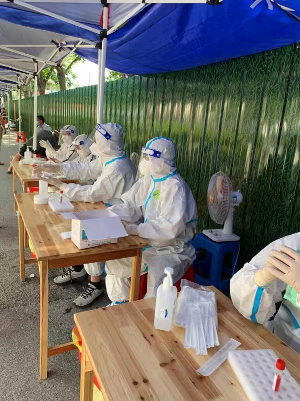 弘扬中专作为核酸检测采样点,朱为群副校长第一时间到达现场,组织校相关人员配合社区工作人员一同布置场地。我校疫情防控指挥部共出动10名志愿者参与配合社区核酸检测(第四次)工作,分别为毛秋烨、沈丽霞、陈宏、胡绪亮、梁徐磊、张华、关瑞、王如元、王标吉、姜云飞10位同志。该10名志愿工作者任劳任怨,不怕高温酷暑,在炎炎烈日下挥汗如雨,从中午12:30一直坚持到晚上20:20。他们服从组织安排,中途我校沈丽霞、陈宏、关瑞三位志愿者中途被临时调派到董庄核酸检测点。他们用坚强的背影构筑疫情防控的“铜墙铁壁”,用实际行动践行党员初心使命。大家全力服从社区的调度安排,与医务人员、社区人员并肩作战。用实际行动诠释了什么叫“疫情就是命令”。
